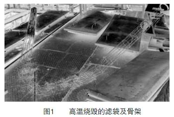 高溫對濾袋的損害是致命的。如黑龍江某煤粉干燥窯,由于干燥后煤粉顆粒非常細小又特別粘,清灰不理想,使濾袋表面存留大量的干燥后的煤粉,而這種干燥后的煤粉,燃點又非常低,當高溫煙氣進入除塵器后,會迅速點燃濾袋表面的煤粉,導致整臺除塵器的濾袋及骨架全部被燒毀(如圖1)。從圖1可以看出,濾袋表面殘留大量的干燥后的煤粉,從其左上角也可見箱體被燒毀。